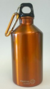 Kuparinvärinen juomapullo kiipeilijänkoukulla, jossa kaiverrettuna PartioScout.