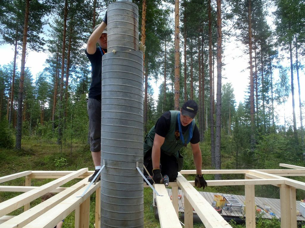Ilves13-raksaleirin tunnelma on teltan katossa. Leiri nousee vauhdikkaasti, eikä hellekään hiosta työn touhua.