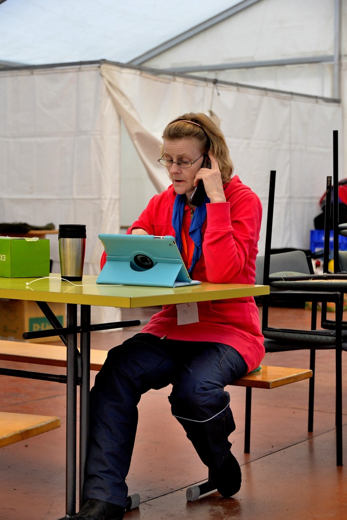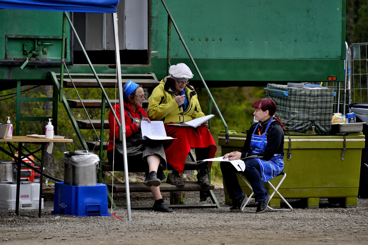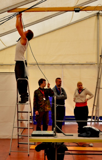 Sähkötiimi veti piuhat pääteltan kattoon. Leirivalaistus on parempi kuin koskaan ennen: tarjolla on kunnon työmaavaloja kesäillan hämärään.